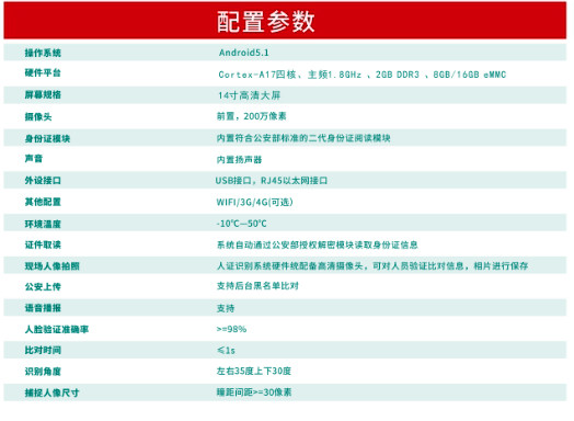 Cortex-A17四核,主频1.8GHz,2GB内存,8GB/16GB存储命回,安卓系统 ,身份证读取,高清摄像,语音播形,高清大屏。。